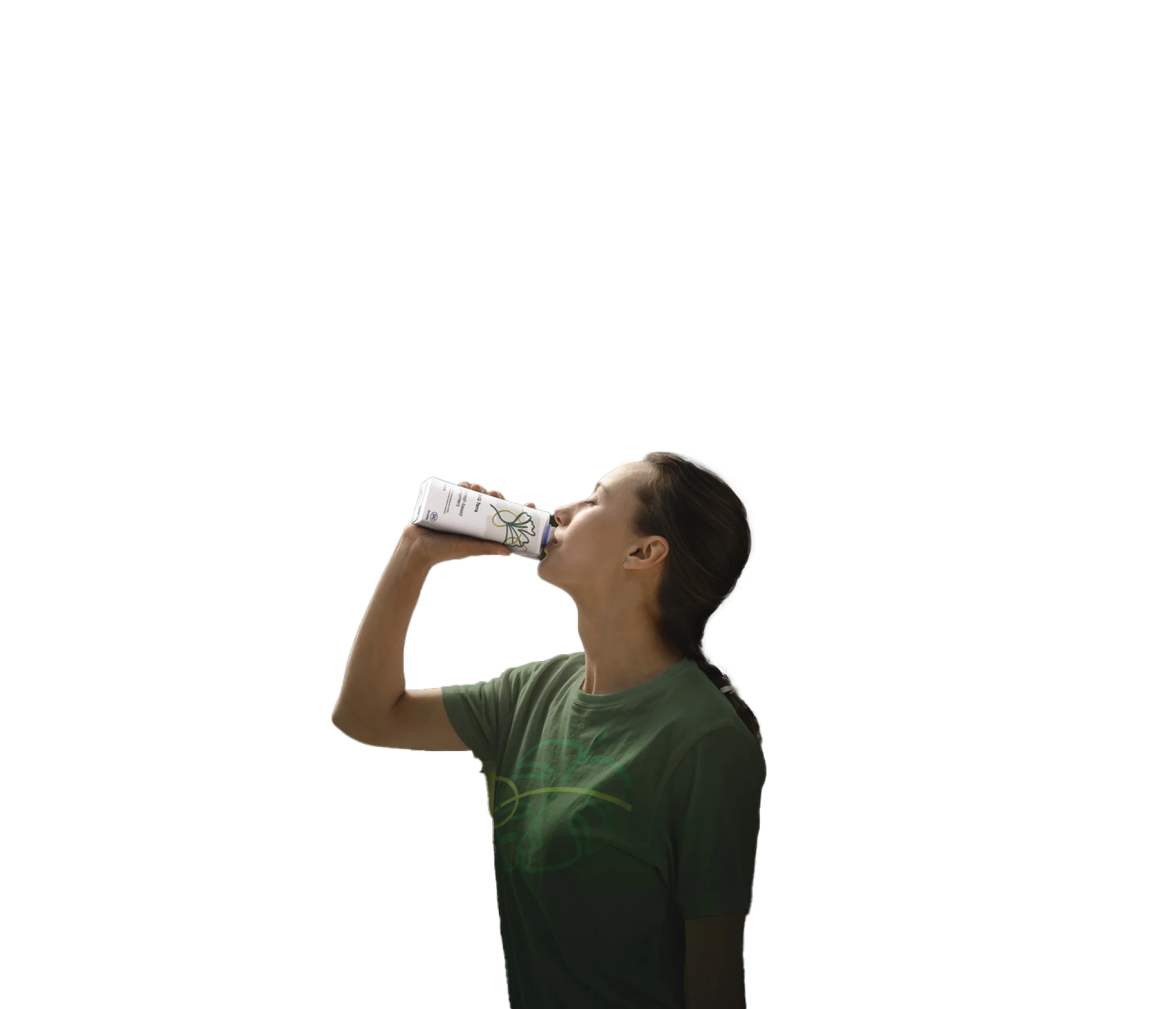 The image features a woman drinking from a SIG package, likely in a park or forest setting, as she is surrounded by trees.